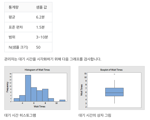 예를 들어, 패스트푸드점의 관리자는 일주일 동안 점심 시간 동안 고객의 대기 시간을 추적하고 데이터를 요약한다.